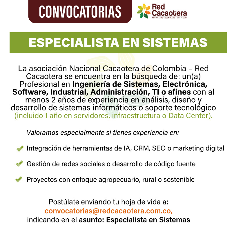 Postúlate enviando tu hoja de vida a: convocatorias@redcacaotera. com.co, indicando en el asunto: Especialista en Sistemas