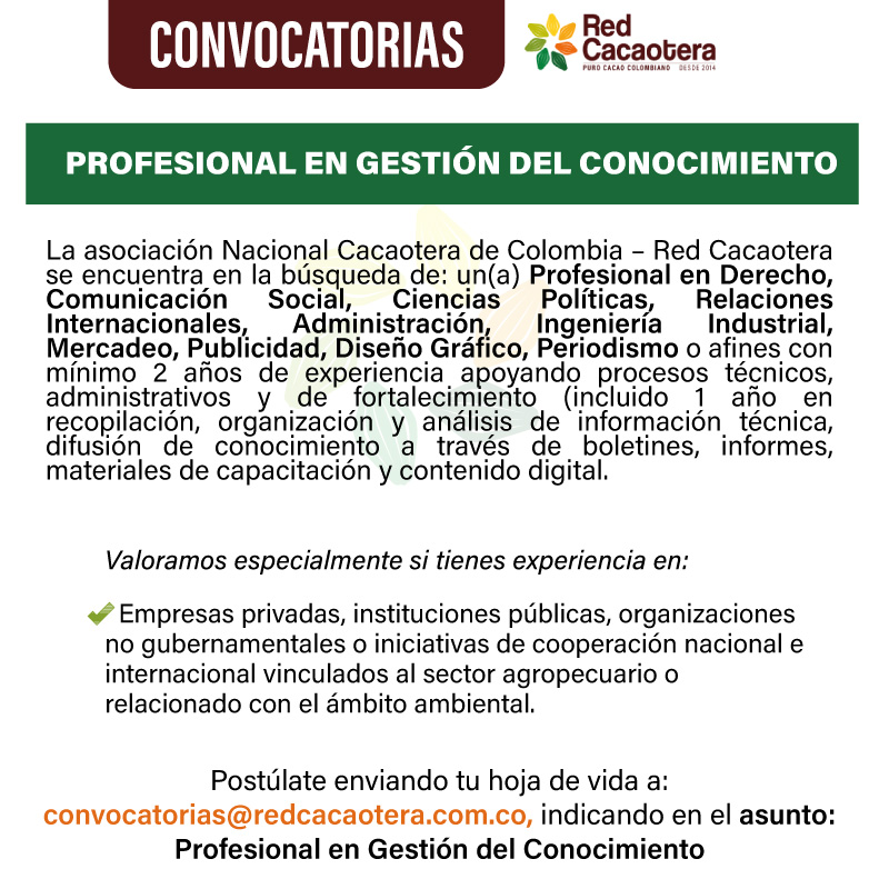Postúlate enviando tu hoja de vida a: convocatorias@redcacaotera.com.co, indicando en el asunto: Profesional en Gestión del Conocimiento
