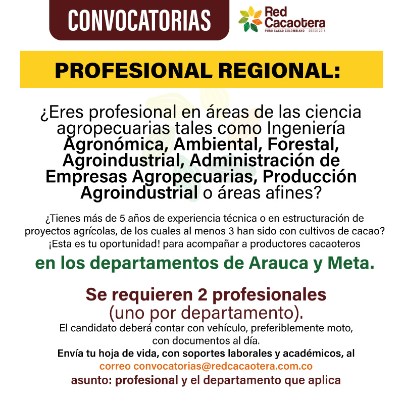 Envía tu hoja de vida, con soportes laborales y académicos, al correo convocatorias@redcacaotera. com.co