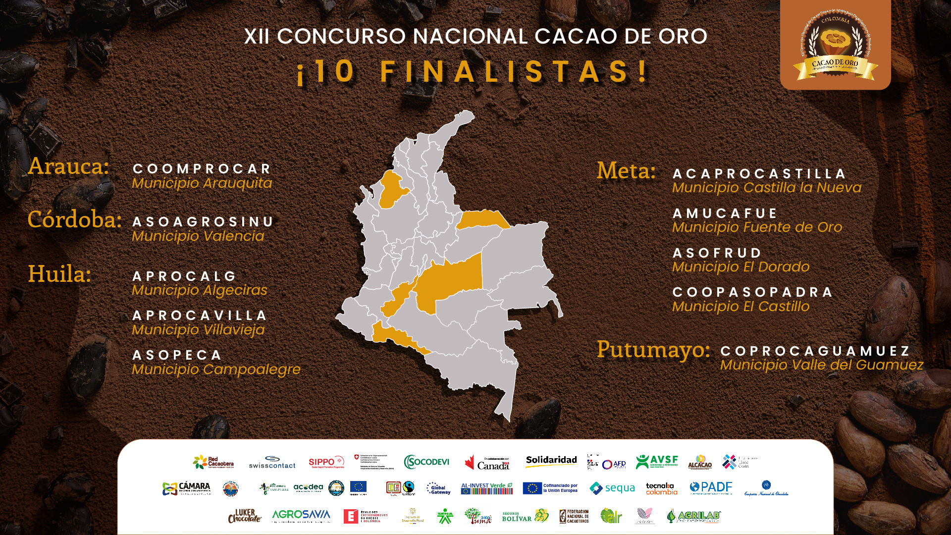 Después de una exhaustiva evaluación realizada por el Panel Internacional de Catación, la Red Cacaotera de Colombia y el Comité Organizador del XII Concurso Nacional Cacao de Oro se complacen en anunciar a las 10 organizaciones finalistas que destacan por su compromiso y calidad: